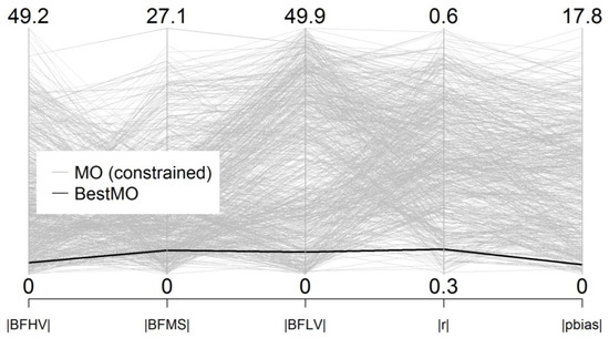 The trade-off in evaluation criteria in a constrained search using the Borg MOEA for sub-basins 1–18 based on streamflow signatures and remote sensing-based evapotranspiration during the calibration period (2002–2007). The location where the line intersects each vertical axis designates the relative objective value. The gray lines represent the efficiency measures in the provided parameter space (MO (constrained)), while the solid black line represents the selected best trade-off (BestMO) from the Pareto solution set. Note that the correlation coefficient is defined as 1−r.