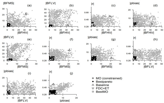 Figure 8 presents the parallel coordinates plot to visually represent the five-dimensional evaluation criteria, where each line represents a trade-off in the multi-criteria evaluation. Here, the “parallel plots” clearly indicate that the “model calibration problem is inherently multi-objective” [63]. Additionally, Figure 9 presents the trade-offs considering a combination of two criterion spaces (i.e., 5 ×2 = 10 combinations). The gray lines (dots) in Figure 8 and Figure 9 represent the subset of evaluation measures (out of 3000 function evaluations) that satisfy the within 50% bias for the streamflow signatures and evapotranspiration, as well as a higher than 0.3 correlation for evapotranspiration (i.e., MO (constrained)). What is apparent from these multiple illustrations is the existence of a high degree of compensation within the five evaluation measures, suggesting that a parameter set that returns a low bias for the high-streamflow regime results in a poor performance for the other evaluation criteria and vice versa. This is particularly notable for watersheds dominated by a semi-arid climate (i.e., sub-basins 19–89) compared to the semi-humid watersheds (i.e., sub-basins 1–18) (see Figures S1 and S2). Interestingly, however, there is less compromise between the biases in the slope of the FDC and the goodness-of-fit measures for evapotranspiration (i.e., r and pbias), thereby resulting in considerable parameter solution sets that satisfy a less than 5% bias and a correlation above 0.6 (black dots in Figure 9f,g and Figure S2f,g). For instance, for sub-basins 19–89, there are about 487 (r vs. BFMS) and 218 (pbias vs. BFMS) parameter solution sets out of 685 solutions (MO (constrained)). This signifies that a good estimation of model parameters that control the vertical soil water redistribution such as SOL_AWC and ESCO using signature measures from the slope of the FDC could also assure a good evapotranspiration prediction and vice versa.