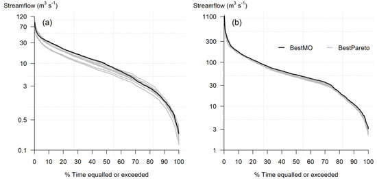 Figure 10 presents the mean annual FDCs of the simulated streamflow using the selected Pareto set solutions for the Nyangores and Mara Rivers. These plots depict a somewhat comparable streamflow regime pattern for the selected Pareto set solutions (BestPareto) for both rivers, indicating the extent to which the historical streamflow signatures and remote sensing-based evapotranspiration constrained the SWAT model parameters. The median streamflow ranges from 5.2 to 8.1 m3/s for the Nyangores River at Bomet and from 38 to 42.3 m3/s for the Mara River at Mines.