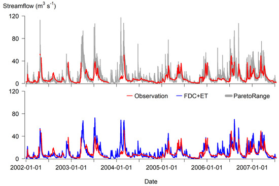The use of several diagnostic streamflow signatures during the manual calibration can help constrain different aspects of the simulated streamflow simultaneously. The high-streamflow regime signature (exceedance probability < 0.05) is useful to constrain parameters that control the surface runoff generation (Figure 4). The slope of the mid-flow segment of the FDC (exceedance probability between 0.2 and 0.7) provides information to constrain parameters relevant to infiltration and the redistribution of water in the soil profile. The low-streamflow regime signature (exceedance probability between 0.7 and 1.0) is helpful for adjusting the baseflow response. The parameters that control evapotranspiration processes were constrained using the remote sensing-based evapotranspiration product [51].