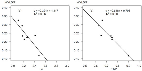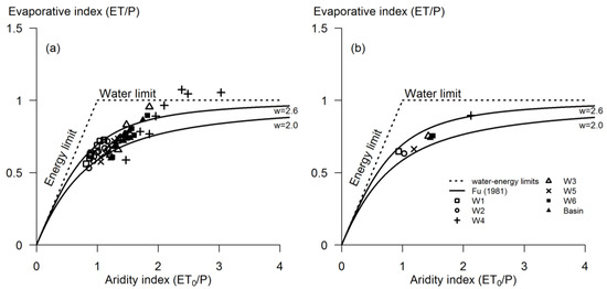 Budyko [58] postulated that the available energy and water primarily control the long-term catchment water balance, whereas the characteristics of the catchment (soil, topography, geology, land cover, etc.) play a secondary role [59,60,61]. We used the Budyko diagram—which depicts the evaporative index (ET/P) as a function of the aridity index (ET0/P)—for a qualitative diagnostic assessment of the dominant hydrologic processes as simulated by the calibrated SWAT model. Additionally, to evaluate the consistency of the simulated annual evapotranspiration and total water yield across the basin, we fitted the Budyko-like Fu curve [62]. In Fu’s equation (Equation (6)), the parameter w represents the integrated effects of landscape characteristics on the water balance dynamics of a watershed [61].