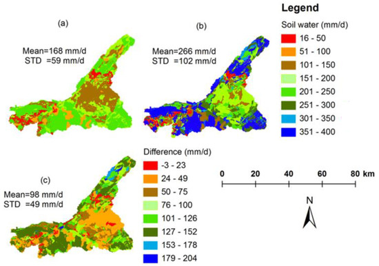 One of the major synergies noted in this study is the effectiveness of the streamflow signature measures and remote sensing-based evapotranspiration to constrain the SWAT model parameter related to the soil water balance. As illustrated in the automatic multi-objective calibration in Section 5.3, a low bias in the slope of the FDC tends to give a high correlation and low bias for evapotranspiration. Figure 15 presents the daily soil water content simulated by the baseline and the calibrated SWAT models averaged over the basin. The daily mean soil water content ranges from 129 mm/d (for calibration with streamflow signatures only) to 246 mm/d (for calibration with streamflow signatures and remote sensing-based evapotranspiration), suggesting considerable change due to the calibrated soil parameters. The soil water content is a function of rainfall, soil texture and land cover type, among other factors. As a result, we can observe the remarkable spatial variation differences when the SWAT model is calibrated with streamflow signature measures and remote sensing-based evapotranspiration, as shown in Figure 16. For instance, as depicted in Figure 16b for 5 May 2002 for the model calibrated using streamflow signatures and remote sensing-based evapotranspiration, the average HRU-level soil water content is about 266 mm/d (±102 mm/d), indicating substantial spatial variation in the soil water content. A noticeable difference, on average 98 mm/d (±49 mm/d), is marked between SWAT models calibrated with streamflow signature measures alone and streamflow signature measures combined with remote sensing-based evapotranspiration, as shown in Figure 16c. The observed substantial changes in the calibrated SWAT model simulated soil water content are mainly attributed to the changes in the soil depth (SOL_Z), the available soil water content (SOL_AWC) and ESCO, as presented in Table 5.