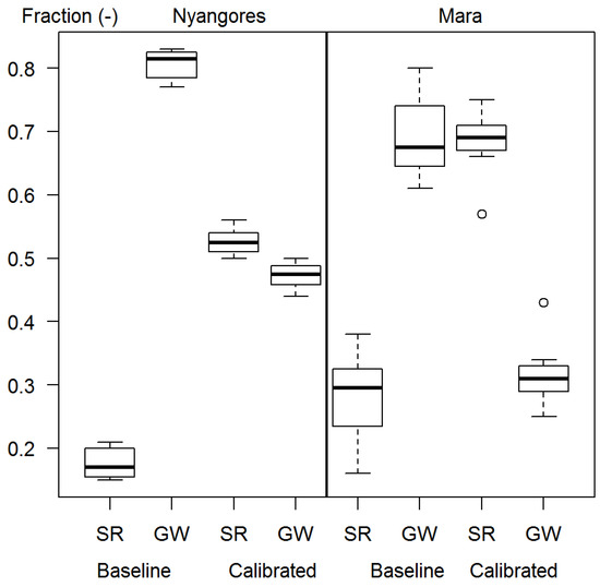 Figure 17 compares the contributions of surface runoff and subsurface streamflow to the total water yield annually for the Nyangores (W1) and Mara (W6) Rivers as simulated by the baseline and calibrated models. The baseline model exhibits a dominance of the subsurface flow contribution to the streamflow at both locations. In contrast, the calibrated model exhibits a comparable contribution of water from both the surface and subsurface components for the Nyangores River and surface runoff domination for the Mara River (Figure 17). On average, the surface runoff and subsurface flow contributions to the total water yield in the Nyangores (Mara) River are about 53% (68%) and 47% (32%), respectively. Given the physical characteristics of these watersheds (land use, soil and climate) shown in Table 1, we would expect differences in the dominant streamflow response behavior for the two watersheds. In theory, for a humid watershed (i.e., W1) with a moderate infiltration rate and a predominant evergreen forest cover, the surface runoff and subsurface flow contributions to the total water yield should be comparable. In contrast, the surface runoff contribution should dominate over the subsurface flow contribution for a semi-arid watershed (i.e., W6) with a moderate to low infiltration rate and a predominant savanna grassland cover. By these standards, the calibrated model shows both realistic and consistent watershed response behaviors when constrained using observed historical streamflow signatures and remote sensing-based evapotranspiration in a multi-objective framework. Our observations are consistent with Coxon et al. [66] and Yadav et al. [12], who demonstrated the dependence of the information content of diagnostics and its ability to constrain catchment response on catchment characteristics. The annual basin-level rainfall, evapotranspiration and water yield range from 951 to 1274 mm/year, 805 to 916 mm/year and 141 to 341 mm/year, respectively, for 2002–2009 (Figure S6). On average (2002–2009), the total water yield accounts for 24% of 1605 mm (W1: the Nyangores watershed at Bomet) and 21% of 1117 mm (W6: the Mara Basin at Mara Mines) of the input rainfall, whereas evapotranspiration accounts for 68% (W1) and 70% (W6). Our results agree with Dessu and Melesse [48], who reported the partitioning of the Mara Basin average rainfall as 70% evapotranspiration and 17% water yield.