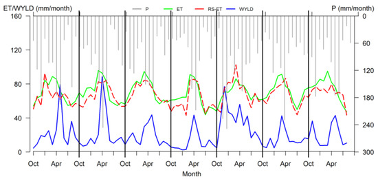 The monthly water balance dynamics for 2002–2009 over the Mara Mines watershed (W6) as simulated by SWAT. The months are arranged according to the hydrological year (Oct–Sept).