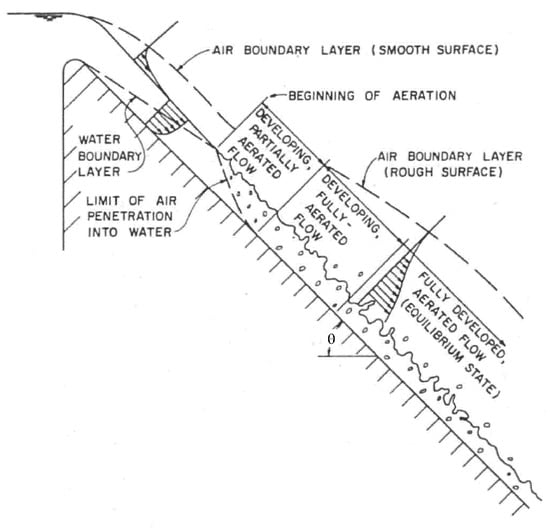 Lane [8] first suggested that the inception of aerated flow is defined by the intersection of the developing boundary layer with the water surface, and this led to empirical relations [26] for estimating the flow distance from the start of boundary layer development to the inception point for hydraulically smooth and rough surfaces. It has also been suggested [10,11,27] that turbulent fluctuations outside the computed thickness of the boundary layer cause aeration to begin when the computed boundary layer thickness reaches about 80% of the flow depth. SpillwayPro takes this approach and estimates the thickness of the boundary layer, δ, using δ/x = 0.0302(x/ks)−1/8 [28], where x is the distance along the flow surface from the initiation of boundary layer development and ks is the surface roughness. The interested reader is also referred to Wood [10], who offers analytical approaches to computing the rate of boundary layer growth in chutes with gradually varying slope and width.