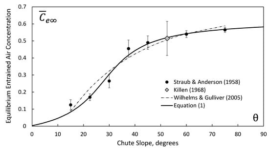 Entrained air concentration in the fully developed aerated flow zone, showing experimental data [9,31], the original curve of Wilhelms and Gulliver [14] and the curve described by Equation (1) that produces more realistic values for low slopes. Error bars are uncertainties in the original experimental values of entrained air as reported by [14].