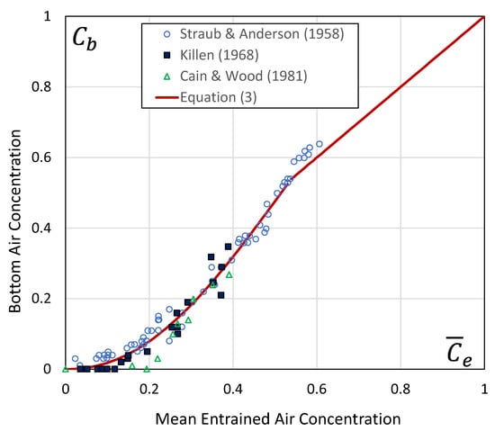 Equation (3) curve relating bottom air concentration to mean entrained air concentration, compared with experimental values [9,31,42].