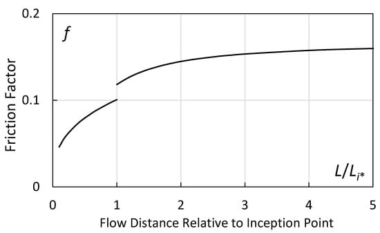 For chutes with slopes of 2:1 or flatter, SpillwayPro relies on energy loss data collected at locations upstream and downstream from the inception point [19,20,60]. On a 4:1 slope [19], the relative energy loss upstream from the inception point, ΔH, could be estimated as ΔH/Ho = 0.3(L/Li*), where Li* was the inception point predicted by [16] (the refined relations for computing the inception point, Equations (6) and (7), had not yet been developed), and Ho is the available head from the upstream reservoir to the point of interest in the chute. Similar energy losses were observed on a 2:1 slope [60]. Downstream from the inception point [20], the relative energy loss was ΔH/Ho = 1 − (L/Li* + 0.51)−0.87. Considering that the overtopping energy head is small compared to the total elevation drop, the friction factor can be estimated as f = 8(ycw/yc)3(dH/dL). The derivative, dH/dL, can be determined from the relative energy loss relations, and ycw/yc can be estimated from empirical relations [22]. A resulting typical relation between f and L/Li* is shown in Figure 5. The friction factor is low at the start of the chute where the boundary layer induced by the steps is beginning to develop and affects just a fraction of the flow, and asymptotically approaches an equilibrium value downstream from the inception point. In SpillwayPro, this approach is adopted with Li* replaced by Li from Equation (6) or (7), modified if necessary for beveled step faces. There is little variation downstream from L/Li* = 1.0, and in fact the observation in [22] that clear-water depth is nearly constant in this zone indicates that the friction factor should also be approximately constant.