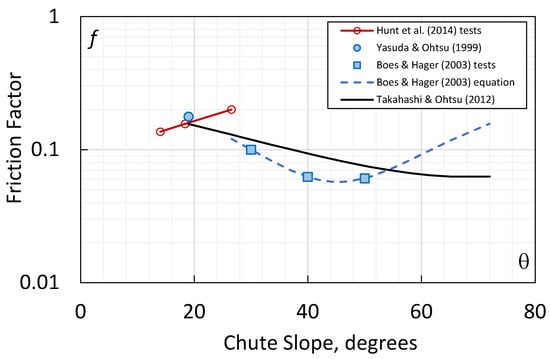 Friction factors for the fully aerated region of stepped chutes vs. chute slope [18,22,45,59].