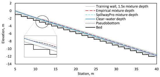 Predicted clear-water flow depths and mixture flow depths at the bottom of the chute are 0.82 m and 1.75 m, respectively, compared with 0.83 m and 1.74 m for empirical equations [18] for the fully developed uniformly aerated condition. The air concentration predictions made by SpillwayPro using Equation (12) [45] are about 2 to 4% lower than the empirical estimates made in [18] ( = 0.53 vs. = 0.57 at the bottom of the chute). The specific energy computed at the bottom of the chute is about 34 m, compared to 28.6 m estimated in [18]. The most significant reason for the difference is probably the friction factor uncertainty discussed earlier.