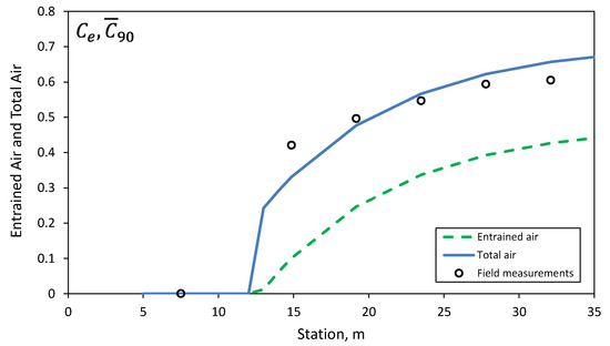 The observed inception point was only 7.5 m downstream from the gate. Several empirical methods employed in [42] predicted significantly greater lengths to the inception point, in the range of 10 to 15 m; SpillwayPro’s boundary layer growth model predicts 12.9 m. The thin flow depth makes the prediction of the boundary layer–water surface intercept point very sensitive to the boundary conditions, i.e., the starting point for boundary layer growth and the presence of any pre-existing turbulence in the flow. Despite the significant differences in the inception point prediction, the modeled values of mean air concentration match reasonably downstream from the inception point. The measured prototype air concentrations increased from 0.42 to 0.61 over the five stations, while SpillwayPro predicts 0.33 at the first station, increasing to 0.66 (Figure 8).