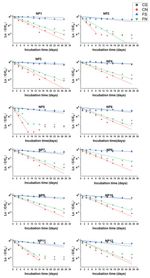 where t1/2 refers to the half-life; Cs denotes the concentration of pollutants in soils after degradation (mg⋅L−1); Ci denotes the initial concentration of NP in soils (mg⋅kg−1); and T denotes the whole degradation time (d).