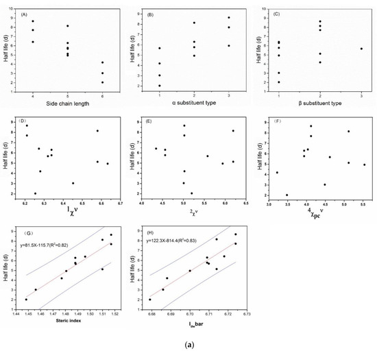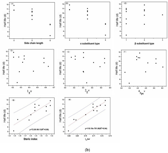The relationship between the half-life of NP isomers and the structures in China soil (a) and Florida soil (b). Note: (A) The length of the side chain, which was divided to 4, 5, and 6 according to the number of carbon atoms. (B) The type of α substitute: 1, dimethyl; 2, ethyl methyl; 3, methyl propyl. (C) The type of β substitute: 1, none; 2, methyl; 3, ethyl. (D–F) Molecular connectivity. (G) Steric index. (H) Mean information index for the magnitude of distance. Each black point represents the isomer; the red solid line represents the regression line and the blue solid line represents the 95% confidence limit.