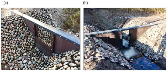 For that reason [38] and also due to the need to provide more advanced, modern solutions, the development of water-damming regulators in drainage ditches has become one of the goals of the INOMEL project—“Technological innovations and a system for monitoring, forecasting and operational planning of drainage activities for precise water management on the scale of a drainage facility” (BIOSTRATEG3/347837/11/NCBR/2017). The innovative character involved the typical elements of the beams, which are widely applied in civil engineering, pointing at advantages such as the flexibility of installation and water damming. The underlying theory involves proper weir types, e.g., sharp-crested weir, and relevant discharge equations that cannot fully support the cases analyzed herein. The resolved modeling experiment aimed to determine relationships, which, indeed, were not well-defined by existing formulas and therefore required an empirical approach.