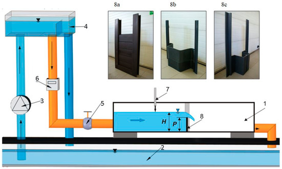 Scheme of the entire experimental site: 1—flume; 2—bottom tank; 3—pump; 4—upper stability tank; 5—regulating valve; 6—electromagnetic flow meter; 7—precise water gauge; 8—regulators of water damming in the ditches; 8a—rectilinear regulator; 8b—labyrinth regulator; 8c—compound regulator; H (cm)—top water depth; P (cm)—height of the regulator overflow (photo by Z. Popek).