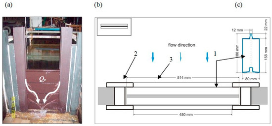The experimental site for regulators in the hydraulic laboratory is shown in Figure 2. The use of empirical laboratory tests of the prototype at a 1:1 scale resulted from the ability to study a very diverse form of flow through the gaps, between the beams, through the horizontal seals of the beams, along the guides and through the locks on the beam connections. The obtained results were approximated by equations for which the coefficients were calculated according to the data from the model, which is not feasible to derive from available weir equations. The tests were carried out in a concrete channel (1 in Figure 2) 1.07 m in width and 1.20 m in depth. The site was supplied with water in a closed-circuit system, which included: a pressure expansion tank (2 in Figure 2), a suction and pressure pump (3 in Figure 2), pipelines supplying the measuring station, pipelines for water discharge and a bottom tank. The water installation was equipped with a control valve and an electromagnetic flow meter (ENKO MPP600 DN60-type, Enko, Gliwice, Poland) with a flow rate measurement accuracy of ± 1%. A water gauge (MICRO MD-2108-type, Micro, Otmuchow, Poland) (7 in Figure 2) with a reading accuracy of ± 1.0 x0−4 m (±0.01 cm) was used to measure the water levels. The water stream flowed with a fixed, controlled intensity Qc (dm3⋅s−1) to the regulator from the upper tank, in which the position of the water table was kept constant. The tests were carried out under the conditions of a steady flow of the water stream, and its intensity was regulated by a valve in the supply conduit and controlled by an electromagnetic flow meter.