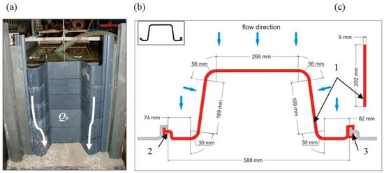 Both U and Z shapes showed a characteristic, developed crest line (Figure 4 and Figure 5), and, it should be stressed, the length of this line Lp was greater than the outlet width by 59 and 78 percent, respectively. As was already pointed out, the determination of discharge characteristics for such regulators could not rely on equations in the available literature since they mainly consider straight-line weir crests. Moreover, they assume the complete tightness of the constructions, which was not the case of successively placed beams analyzed herein; therefore, an experimental approach was required to assess the design and function of the regulators under variable hydrostatic and hydrodynamic loads. The detailed structure of the analyzed regulators is shown in Figure 3, Figure 4 and Figure 5. The arrows in Figure 3, Figure 4 and Figure 5 show the places of intense effective flow.