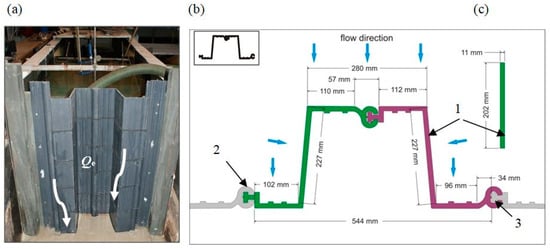 The regulators used in the tests were made of typical plastic sheet piling elements. There were three prototype beam regulators (Table 1, Figure 2): S—straight; U—labyrinth; and Z—compound. The S regulator was made of straight beams, the U regulator was made of uniform, non-split sheet pile elements of tight scraps, and the Z regulator beams consisted of two sheet pile elements with an additional lock connecting both parts vertically. The prototypes of the regulators (8a, 8b and 8c in Figure 2 and Figure 3, Figure 4 and Figure 5) were made on a 1:1 scale, that is, with their actual dimensions. Thus, it was not necessary to convert the constructional and hydraulic parameters into natural (terrain) conditions.