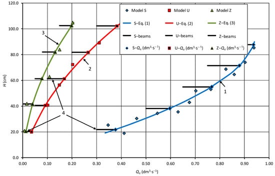 Effective flow Qe of the tested regulators depending on the water depth H: 1—S model; 2—U model; 3—Z model; 4—levels of the upper edges of the beams.