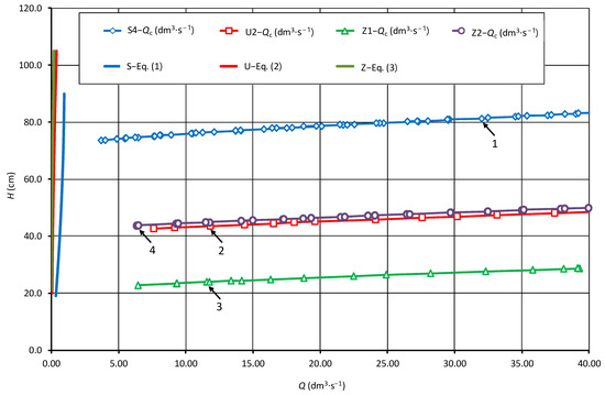 Discharge curves of beam regulators at different heights of the overflow edge position: 1—variant S4; 2—variant U2; 3—variant Z1; 4—variant Z2.