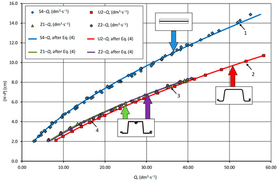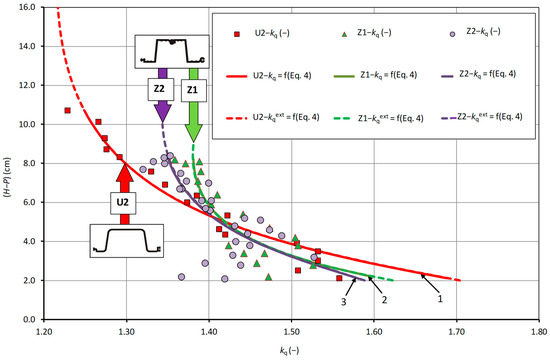 The coefficient kqi = qi/qSi (–) was calculated as the ratio of qi of the unit flow rate of the regulators U2, Z1 and Z2, with a developed shape, to qSi of the unit flow rate of the rectilinear S regulator, with the same value (H − P) and water depth in the top position. Figure 10 shows the values of the coefficient kqi of the increase in flow calculated for the measuring points and the curves of changes in this coefficient, calculated according to the developed regression equations kqF(i) = Fqi/FqSi described by Equation (4) with the parameters in Table 2, where: Fqi—unit flow rate calculated according to the function Fqi = F(H − P)i and developed for variants U2, Z1 and Z2; FqSi—unit flow rate according to FqSi = F(H − P)Si of the function for variants S1 and S2. The approximation curves developed according to Formula (4) were used to extrapolate the value of the kqi (–) coefficient into the filling zone (H − P) above the test range.
