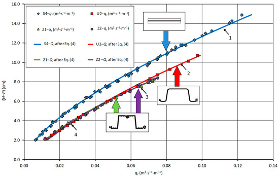 The tested regulators, apart from the beam shape, differed in the width of the overflow opening between the vertical side limitations, that is, the beam gids. The hydraulic efficiency of the tested regulators was determined by the characteristics of the unit flow rate q (m3·s−1⋅m−1) depending on the damming height above the overflow crest (H − P). The unit flow rate qc = Qc/b (m3·s−1⋅m−1) was calculated as the quotient of the total flow rate Qc (m3⋅s−1) and the width b (m) of the opening between the regulator gibs (Table 1), the values of which were: b = 0.450 m for the S model (Figure 3); b = 0.588 m for the U model (Figure 4); b = 0.544 m for the Z model (Figure 5). The regulator with rectilinear closure S was adopted as the base structure to which the unit flows of other regulators were compared: U2, Z1 and Z2, with a crest line developed in the plan. In practice, more closure solutions were not able to be constructed in a focused, short-term project. The measurement points and the unit control flow regression curves qr = qc − qe for different damming levels of the tested regulators are shown in Figure 9. These curves are described by a non-linear model using Equation (4) with the coefficients in Table 2.