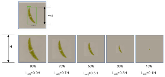 For further understanding about the effect of relative object size, the model performances were tested using the image including an object with 10%, 30%, 50%, 70%, and 90% of the size of the entire image. The images of two genera Closterium sp. and Pseudopediastrum boryanum were used for the test, where the relative object sizes were 61.7% and 35.2% of the entire images, respectively (Figure 8).