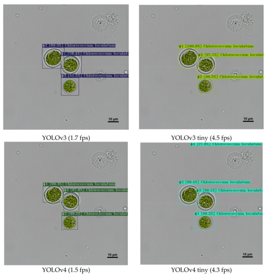 The results showed that YOLO v4 had a better performance than YOLO v3, both in general and for the detection of small-sized objects. The tiny version models worked with noticeably higher model accuracies and ten times faster object detection time compared to previous studies. The performance of the tiny version models could be attributed to the fact that fewer algal genera with less complicated morphological shapes were screened. This resulted in extracting less information from convolutional layers during the object detection process for the classification of algal cell images.
