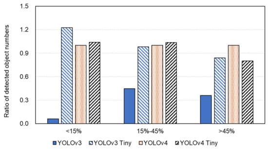 The results indicated that YOLO v4 performed better for images with various relative object sizes. The tiny versions had a more stable performance than the standard versions for both v3 and v4 models.