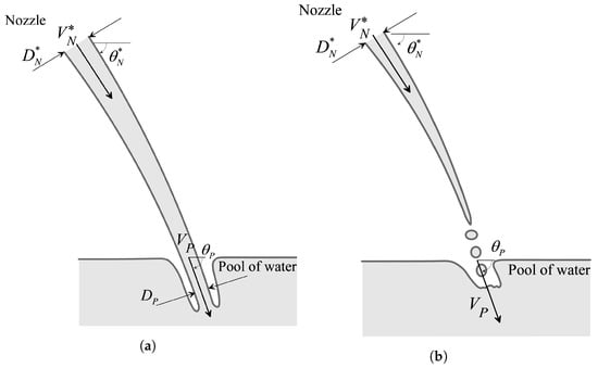 As the jet attains the water level, the phenomenon is mainly influenced by the gravity force, being characterised by the impact angle, , the diameter, , and the mean velocity, (Figure 1). The plunging jet momentum results in the penetration of the stream into the pool of water (Figure 1a) or droplets being formed (Figure 1b), creating a meniscus void, with a cylindrical shape, in the pool surface. The air entrainment results from the volatility of the air–water interfaces, which is also known as Helmholtz–Taylor hydrodynamics instability []. The air entrainment by a plunging jet is frequently encountered in practice, namely, in cases of fluid aeration [,,].