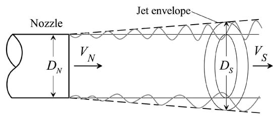 A submerged circular nozzle generates an axisimmetric jet with a mean velocity and a diameter which, independently of the initial flow regime, being laminar or turbulent, becomes turbulent at a certain distance from the nozzle []. The discontinuity between the jet mean velocity and the water in the tank at rest is highly unstable, and due to viscosity, the neighbouring fluid layers are increasingly drawn into the motion, embodying part of the fluid at rest and sweeping it along, giving rise to a mixing layer downstream of the nozzle (Figure 2). The thickness of the mixing layer, also called the shear layer, increases with the distance from the nozzle []. In the mixing layer, coherent structures (vortices) are formed, and their sizes are of the order of magnitude of the layer thickness—the fluid particles from the tank carried by the jet increase the mass flow. Consequently, the jet width spreads out, , taking the shape of a bell, and the mean velocity of the flow, , decreases with the increasing distance from the nozzle [].
