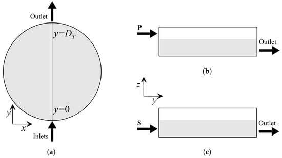 Inlet–outlet configuration–schematics: (a) top view; (b) plunging jet (P); and (c) submerged jet (S).