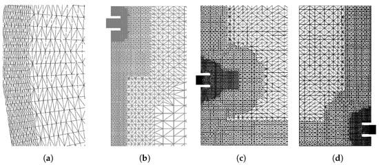 Mesh refinements: (a) top view; (b) nozzle above the water level; (c) nozzle below the water level; and (d) outlet region.