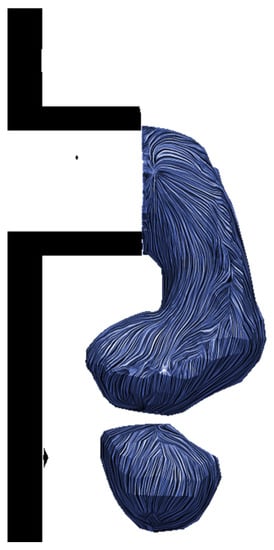 The jet is immediately pushed downwards and, due to the adhesion of the water molecules to other substances or materials, the jet attaches to the inferior wall of the nozzle tip (Figure 5), adding a horizontal velocity component in the wall direction. This phenomenon is known as the ‘Coanda effect’, which is the tendency of a stream to stay attached to a convex surface. This attachment pulls in the flow, adding a horizontal velocity component in the wall direction [,].