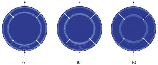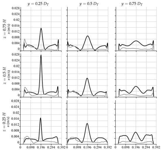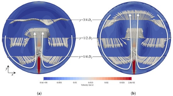 The main features of the flow pattern can be observed in Figure 10, in which velocities vectors are plotted at three heights, 1/4, 1/2 and 3/4H: for , the flow occurs clung to the wall, in the downward direction (Figure 10a); for , the flow pattern seems to be more defined, with a lower downward flow rate than closer to the bottom (Figure 10b); finally, at , the flow pattern is mainly directed to the tank walls (Figure 10c).