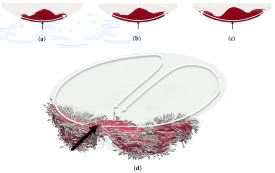 The flow pattern starts to be established. Due to the ‘Coanda effect’ in the tank wall, the water from the jet progresses clung to the tank walls, symmetrically, in the left and right directions (Figure 6a–c). Pinheiro et al. [], using a visual tracer (rhodamine solution), observed this flow pattern.