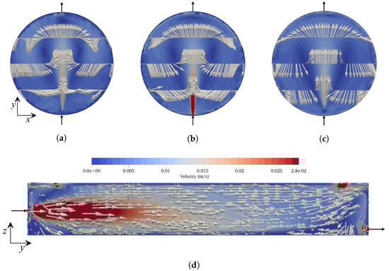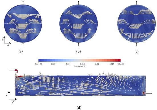 At 200 s, the 3D steady pattern is established in the tank, challenging to characterise; the inflow continues to cling to the wall, and it is disturbed and pushed down by the reverse flow. Figure 8 presents velocity vectors at three tank heights, 1/4, 1/2 and 3/4H of the water level, corresponding to 0.015, 0.030 and 0.045 m, respectively (Figure 8a–c). The flow pattern near the bottom is different from the one near the surface (Figure 8d). After 200 s, the flow pattern shows slight changes due to flow turbulence.
