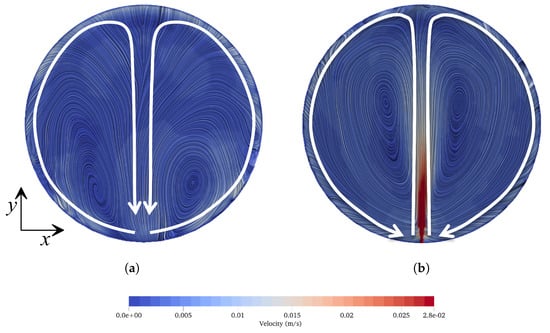 Two streams are observed (Figure 9): the one generated by the jet (entrainment path) and the other by the reverse flow that compensates. The flow pattern is established as the jet reaches the wall, which is symmetrical in the y-direction and divided into two parts. Due to the curved tank walls, the fluid clings to the surface as it moves (‘Coanda effect’), generating a pressure drop at the surface, which allows the liquid to remain clung.