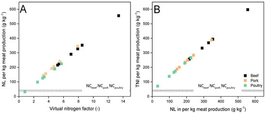 - This is the first study that formed a direct relationship between manure generation by beef, pork and poultry per unit of respective meat production. Nitrogen loss per unit of meat production was found to be directly proportional to the virtual nitrogen factors. The relationship between total nitrogen intake and the corresponding nitrogen loss per kg of meat production was also found linear;