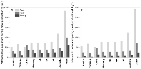 - When comparing several countries, Japan was found to lose the highest amount of nitrogen for meat production, followed by Australia. Therefore, the amount of manure to be treated per unit of meat production was highest in Japan. The nitrogen loss due to meat production was found to be relatively lesser among the US and the European countries due to their advanced nitrogen recovery systems from waste streams;