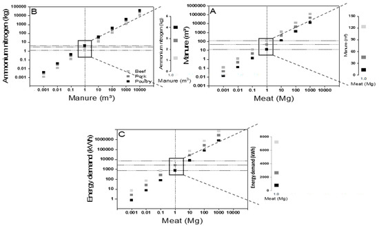 - The results showed that more than 7000 kWh energy was required to recover 140 kg of ammonium nitrogen from beef manure per 1 Mg meat production when considering the zero liquid discharge approach. The energy demand reduced significantly to below 3000 kWh and nearly 1000 kWh for pork and poultry manure treatment for the same.