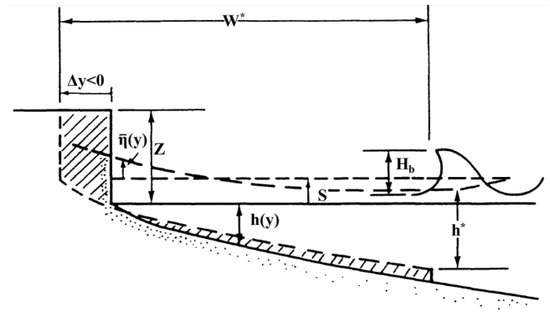 If the beach recession is small with respect to the distance of breaking (|Δy| << W*) and considering κ = 0.78, from Equation (4) the following expression can be obtained: