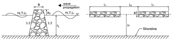 Coastal structures can be divided into hard structures, like seawalls, revetments, offshore breakwaters, and groins; and soft structures such as beach nourishments and submerged berms. Detached emerged rubble-mound breakwaters, made of natural quarry stones, have been among the first defense structures used for coastal protection on several sites around the world. Their application was very extensive also in Italy, becoming larger from the 1960s, in order to reduce beach erosion and encourage maritime tourism. They are, at present, the most common coastal protection structures together with seawalls and groins. They are usually segmented in arrays of separate barriers aligned along a single row parallel to the shoreline, in which the distance between two contiguous breakwaters (Lg) varies from 15 to 60 m, and each breakwater is about 60–110 m long (Ls). The distance from the shoreline (ys) depends on the site conditions and can vary from 50 to 300 m. The freeboard of the berm crest (Rc) ranges from about 1 to 2.5 m and its width (B) from about 1.5 to 8 m. In this work, Rc is considered positive when the breakwater is emerged and negative when it is submerged. A sketch of the main design characteristics of the breakwaters is reported in Figure 2.