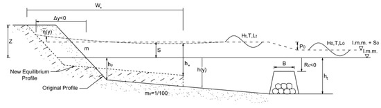 The analysis for the case of the unprotected free beach was conducted for three different slopes m (1/10, 1/20, 1/30) associated with the beach profile shown in Figure 3. In agreement with the dimensionless approach of [6,7], the results of the retreatment of the beach are shown in terms of the parameter Δy/W*. Here, for the chosen beach profile, the parameter W* was computed, according to its definition, as: