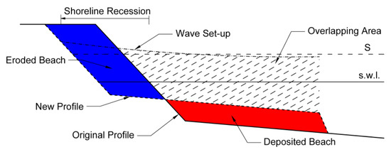 Profile geometry and notation for shoreline recession due to waves and increased water level (adapted from [17]).