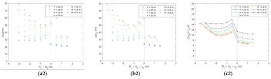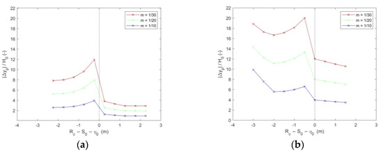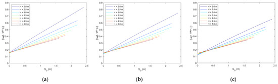 The slope angles of the lines in Figure 5 decrease with the increase of H0 and with the increase of the beach slope (Figure 5, from panels a to c). It must be highlighted that, for the equations used within the model, the wave period does not have any effect on beach erosion in the case of free beaches.