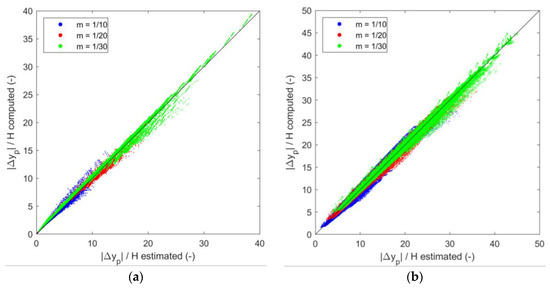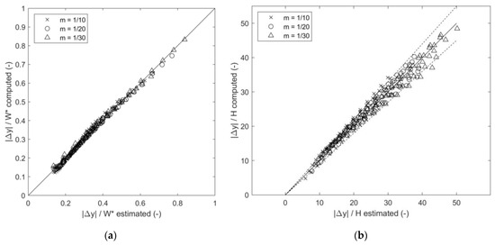 The coefficient of determination of Equation (14) is r2 = 0.993 and the goodness of its fit is reported in Figure 6a where the results of the model (y-axis) are plotted with respect to the results of Equation (14) (x-axis). The dimensionless retreat of the shoreline changes linearly with respect to S by a factor that decreases linearly with H0 and with the fourth root of m. When S0 = 0, Δy/W* varies with the fourth root of the dimensionless wave height (H0/Z).
