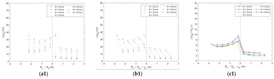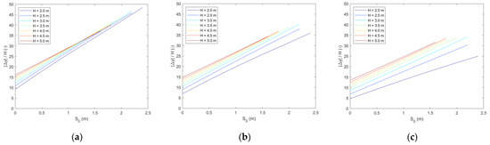 The analysis of the behavior of the parameter |Δy|/W* is not so direct and can lead to misinterpretations. Some common behaviors are evident in the three panels of Figure 5. As expected, given a specific wave height, the dimensionless erosion increases linearly with S0. Opposite to what should be expected, an increase in the value of H0 leads to a smaller |Δy|/W* for S0 larger than about 0.1 ÷ 0.3 m. This happens because of the presence of H0, m, and m0 in W* due to the shape of the chosen beach profile (Equation (11)). Note that by applying Equation (5), which is valid for the equilibrium beach profile and vertical berm, an increase in the values of the wave height leads to an increase in the ratio |Δy|/W*. However, such an increase becomes gradually smaller with the increase of S0. After a specific value of S0, the lines intersect, and an opposite behavior occurs. The decrease of the beach berm height, not shown in the paper, leads to a smaller value of S0 for which the cross point occurs.