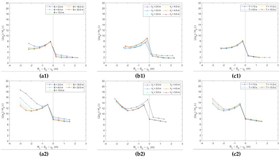 In panels of Figure 5, each line represents the dimensionless recession given by a specific wave height plotted as a function of the offshore sea level rise S0.