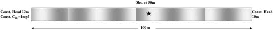 The analytical solution for solute transport in any homogeneous aquifer with a head gradient condition was formulated in [1]. Figure 1 depicts benchmark problem 1, which is aimed at testing the quasi-one-dimensional flow and solute transport. The solute is injected at the left-hand boundary with a pressure head of 12 m. The advective–dispersive transport is monitored at the observation point. The 100 m long flow domain is assumed as a homogenous and isotropic porous medium. Hydraulic conductivity is 1 × 10−4 m/s, and porosity 0.25. The constant head difference between the two sides is 2 m. The simulation period is 200 days. The time step is set at one day (maximum time step size), and the domain is discretised using a mesh size of 1 m. The observation point is located at a 50 m distance from the inlet (i.e., middle of the domain). At the left-hand side, the boundary is defined as fixed concentration Cin = 1 mg/L (i.e., Dirichlet), and free outflow at the right-hand side. Different dispersivity values (0.1, 0.3, 0.5, 0.7, 1, 3, 5, 7, and 10 m) were simulated to conduct the comparison and sensitivity of each simulator to dispersion.